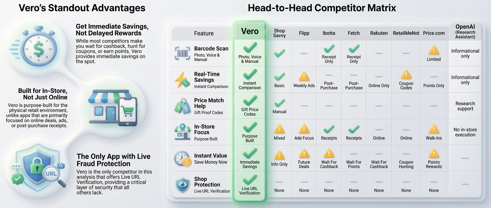 Most savings apps focus on coupons or cashback. Only Vero delivers instant in-store price matching.